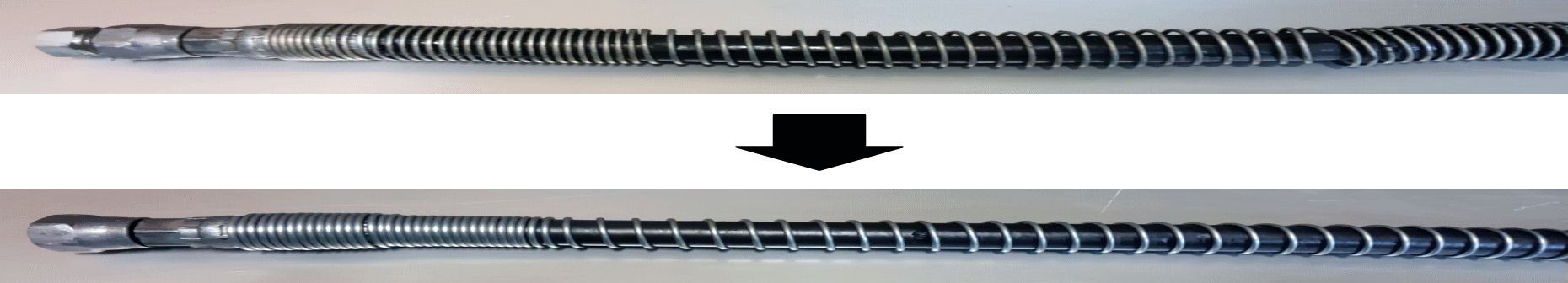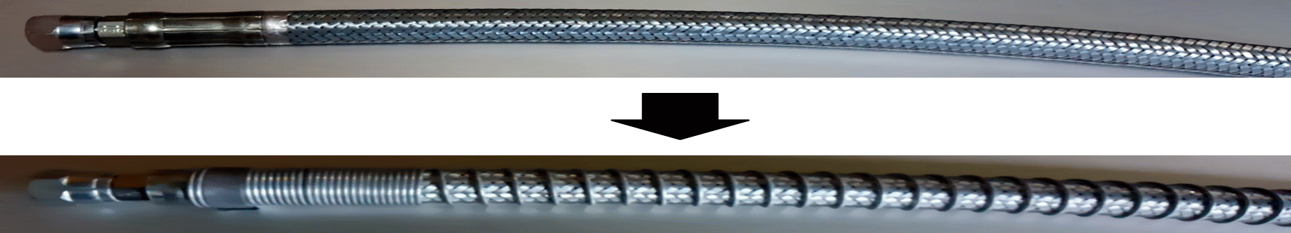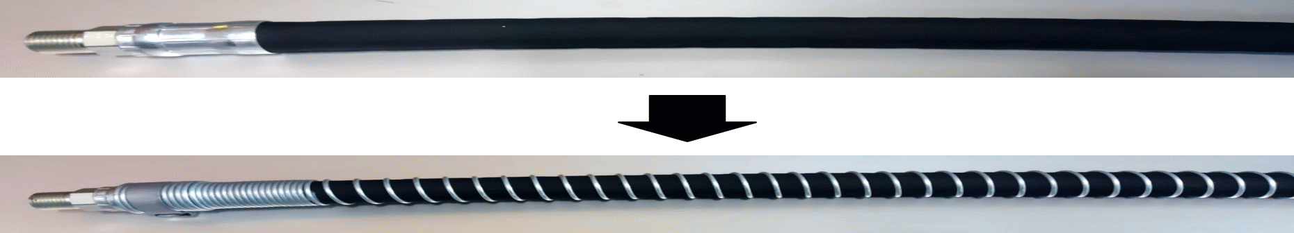 ワイヤーワイニング(外線巻)とは、上記のような状態の時にゴムホース完成後に後付でスプリングで装着する方法です。